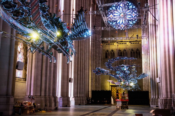 制作完成后,徐冰選擇在紐約哥倫比亞大學對面的圣約翰主教堂中展示自己的作品。大家知道,鳳凰涅槃是中國關于生命重生的故事,教堂則是西方生命重生之地,這只鳳凰上面用了一些五彩斑斕的霓虹燈,這是當代的商業文化元素,鋼鐵是西方工業革命的元素,但作品的文化內核卻是中國的。