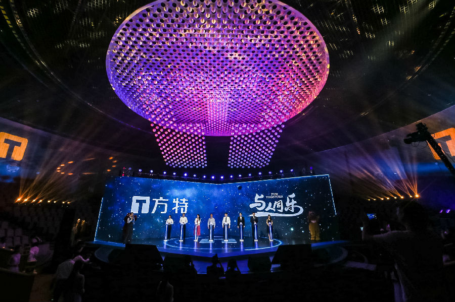 此后,方特品牌煥新儀式隆重舉行。劉道強(qiáng)與眾多嘉賓,以及方特員工及家屬代表、游客代表等,共同登臺(tái)點(diǎn)亮儀式啟動(dòng)球,此時(shí)背景屏幕上閃耀的游客笑臉匯聚成“與人同樂(lè)”,凸顯歡樂(lè)與互動(dòng)的氛圍。期間,舞臺(tái)上空的程控矩陣球緩緩下降,呈現(xiàn)方特LOGO的“T”字造型,巧妙傳達(dá)方特“文化+科技”的發(fā)展理念。